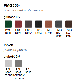 - powłoka - poliester połysk lub poliester mat gruboziarnisty