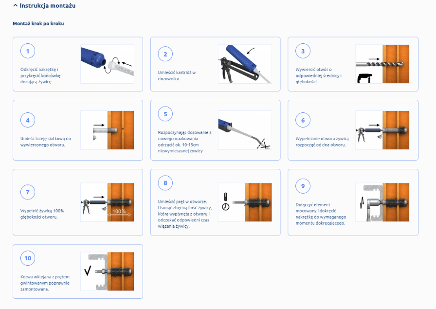 - Natychmiast po aplikacji, ruchem obrotowym umieścić pręt gwintowany lub śrubę w tulei. Usunąć zbędną ilość żywicy, która wypłynęła z otworu i odczekać odpowiedni czas wiązania.