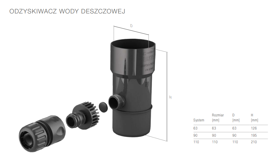 Odzyskiwacz jest przeznaczony do montażu na rurach spustowych o standardowej średnicy 90mm. Wysokość montażu powinna być dostosowana do wysokości zbiornika na deszczówkę.