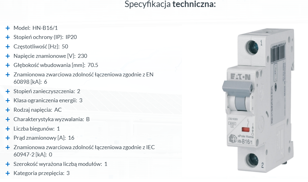 Model 194821 posiada charakterystykę czasową B (tzw. szybką) oraz prąd znamionowy 16A. Zdolność zwarciowa to 6kA.