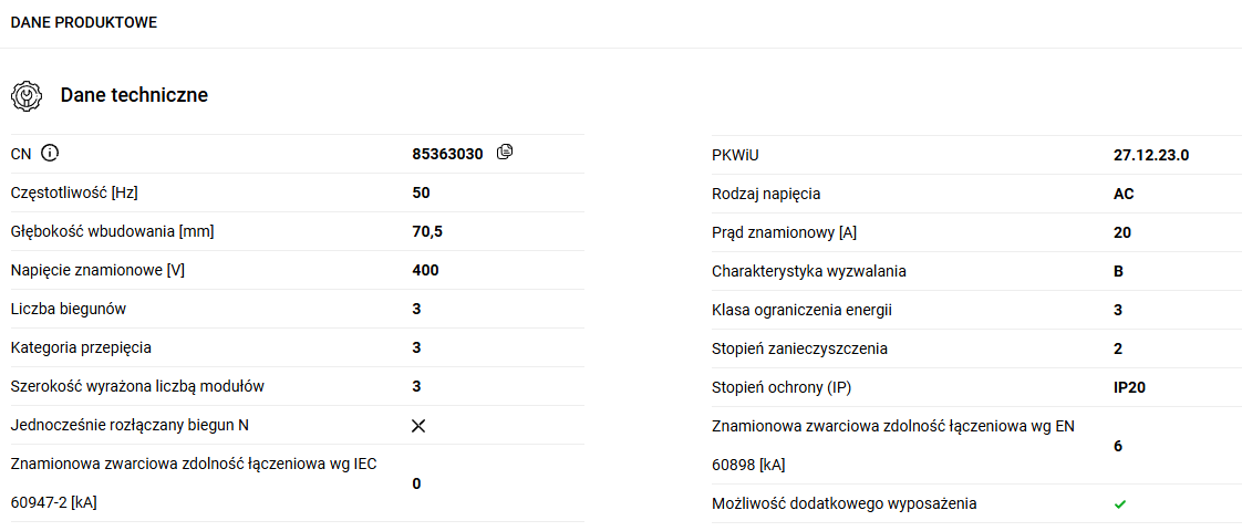 Model 194891 posiada charakterystykę czasową C (tzw. szybką) oraz prąd znamionowy 16A. Zdolność zwarciowa to 6kA.