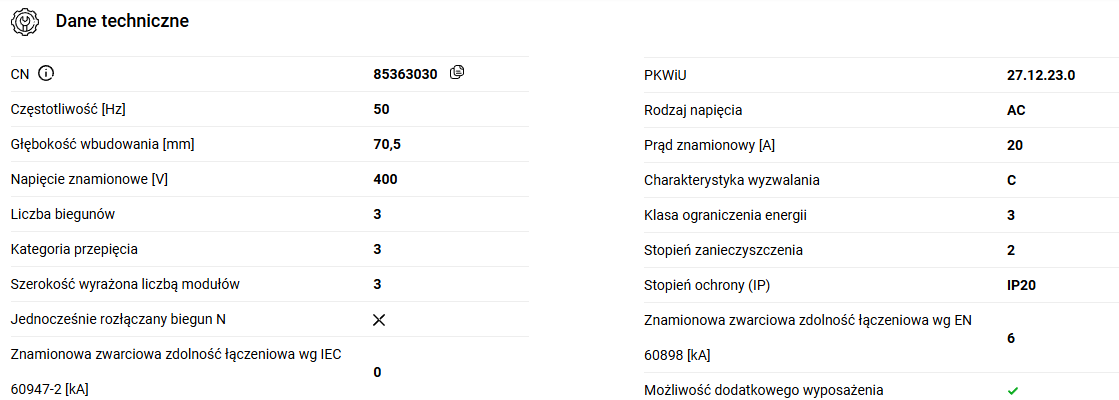 Model 194892 posiada charakterystykę czasową C (tzw. szybką) oraz prąd znamionowy 20A. Zdolność zwarciowa to 6kA.